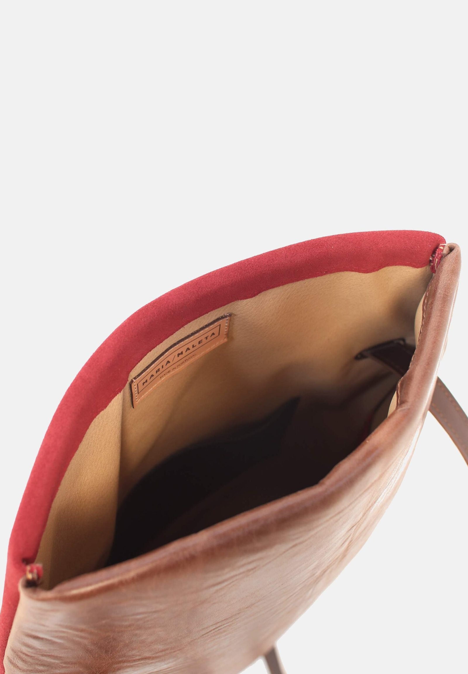 Backpack for 13 inch laptop in brown leather. Back in dark red leather. Elastic with ethnic print. and adjustable straps in brown leather. Two inner pockets. 35×33 cm. Adjustable Straps: 70cm – 80cm. With an extra handle strap. REF. MMBPCA. Made in Portugal