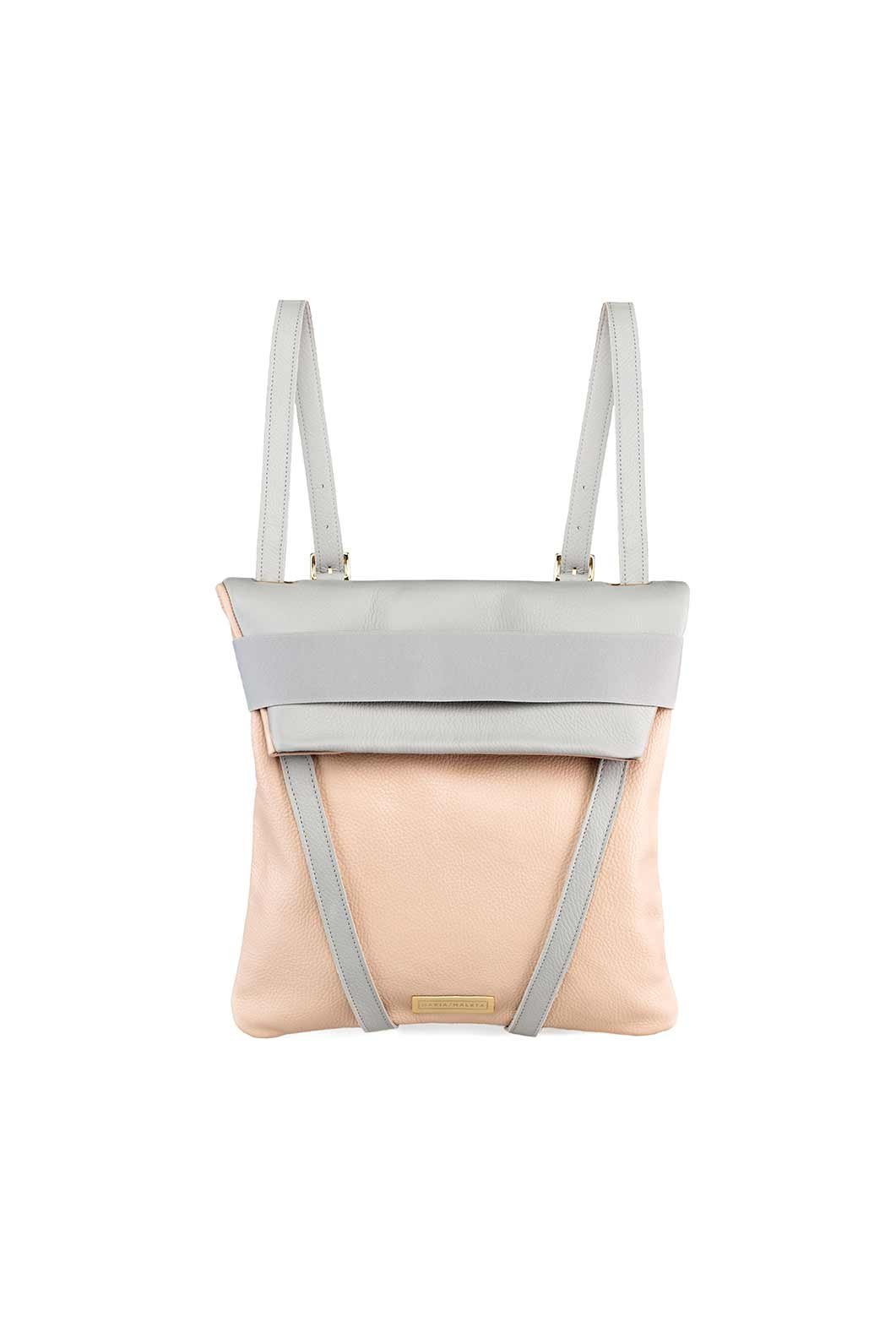 Women’s Backpack in leather. Blush leather and light grey leather. Grey elastic. and adjustable straps 70cm 80cm. Two inner pockets. Dimensions: 35 x 33 cm. With an extra handle strap. REF. MMBPR1 Made in Portugal