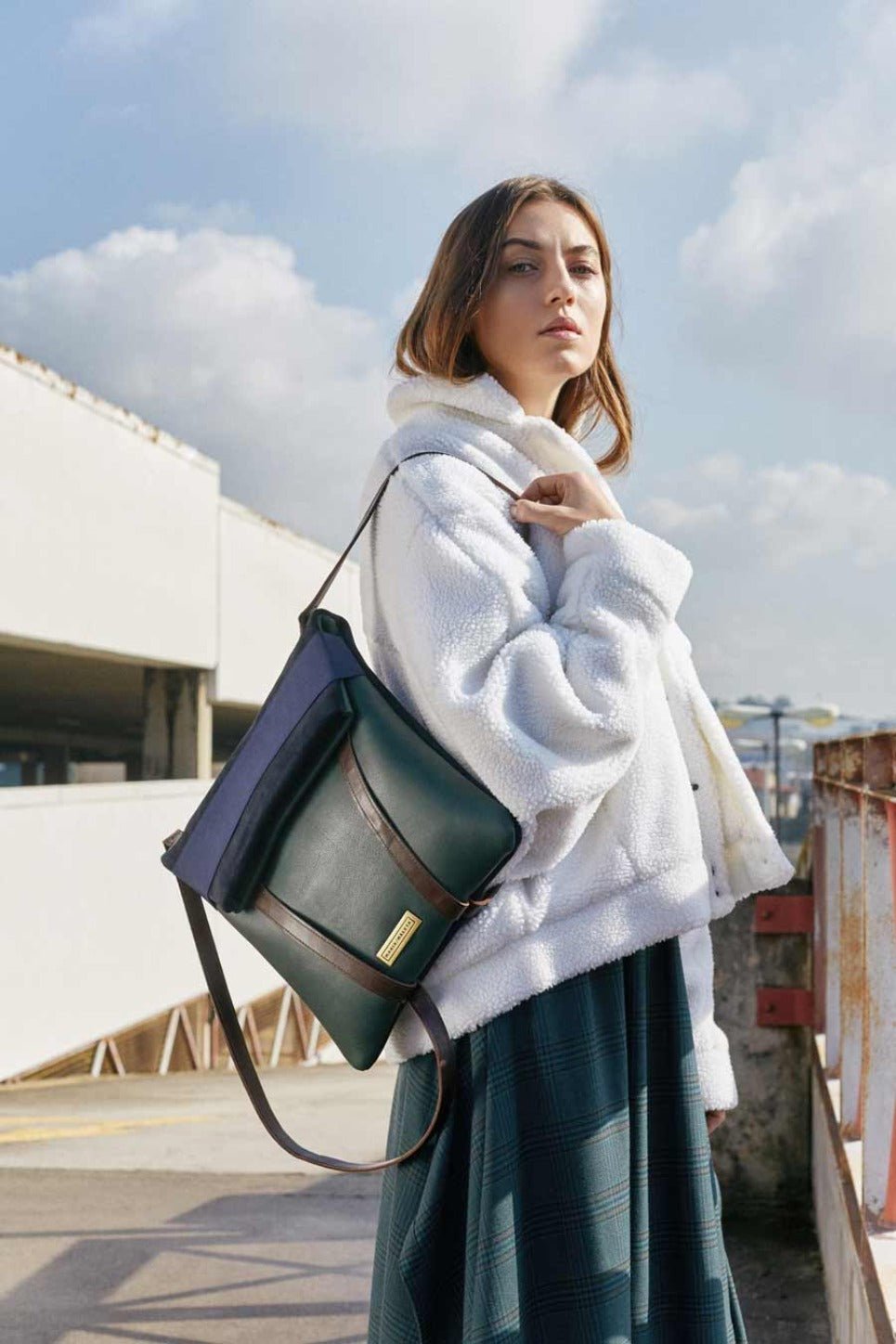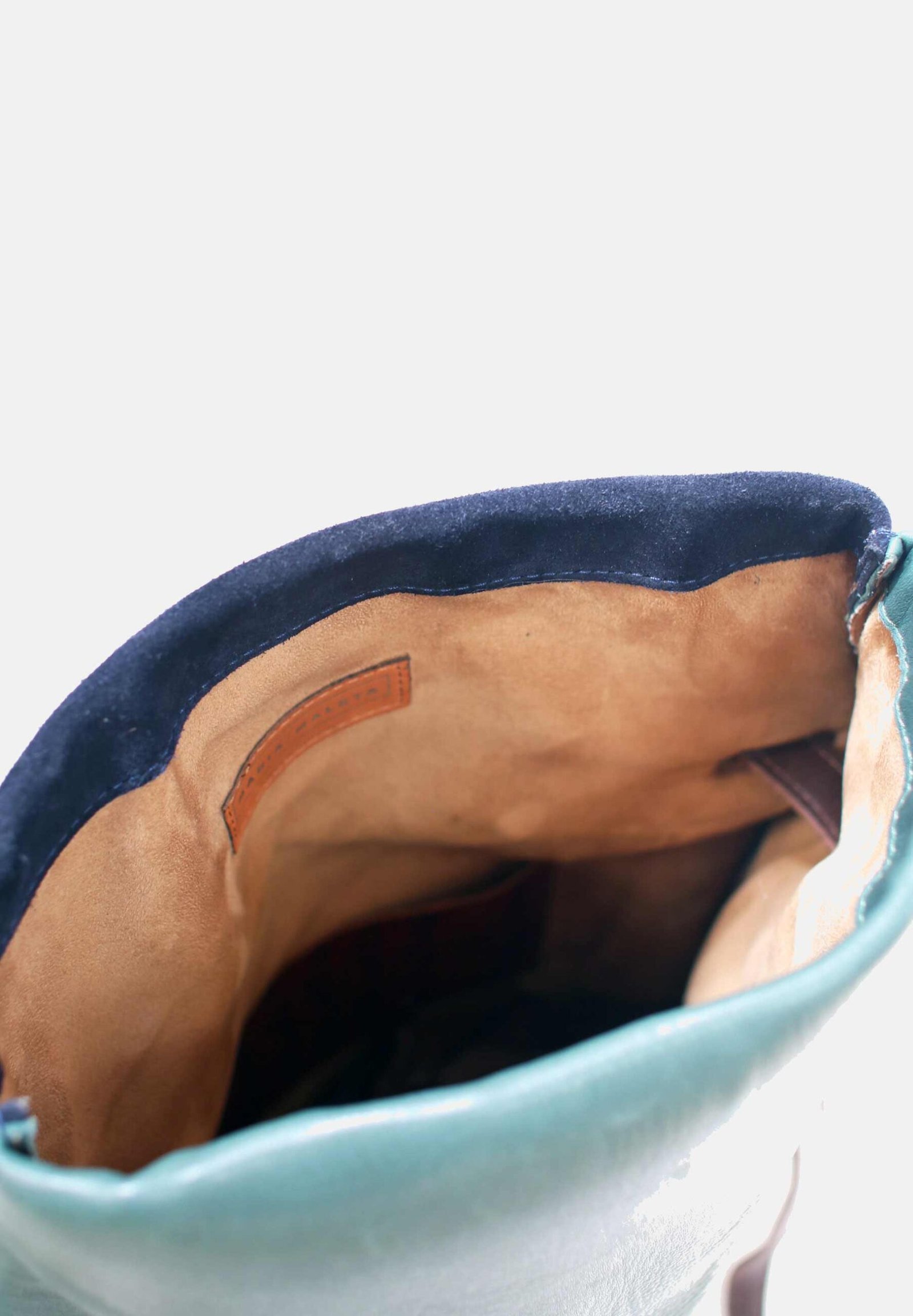 Laptop backpack in leather. Blue navy suede and dark green leather. Upcycled blue elastic from the waste of polyester and cotton. and adjustable straps 70cm – 80cm. Two inner pockets. Dimensions: 35 x 33 cm. With an extra handle strap. REF. MMBMOSS Made in Portugal