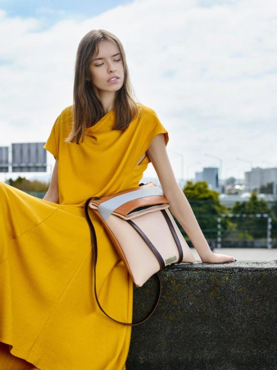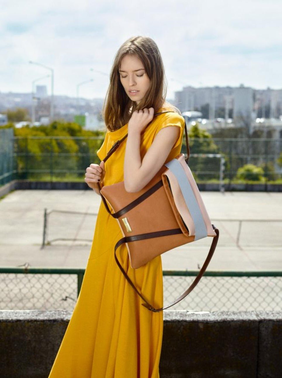 Slim laptop backpack in leather. Brown leather and Back in soft. pale pink color. Grey elastic and adjustable straps 70cm – 80cm. Two inner pockets. Dimensions: 35 x 33 cm. With an extra handle strap. REF. MMBPSD Made in Portugal
