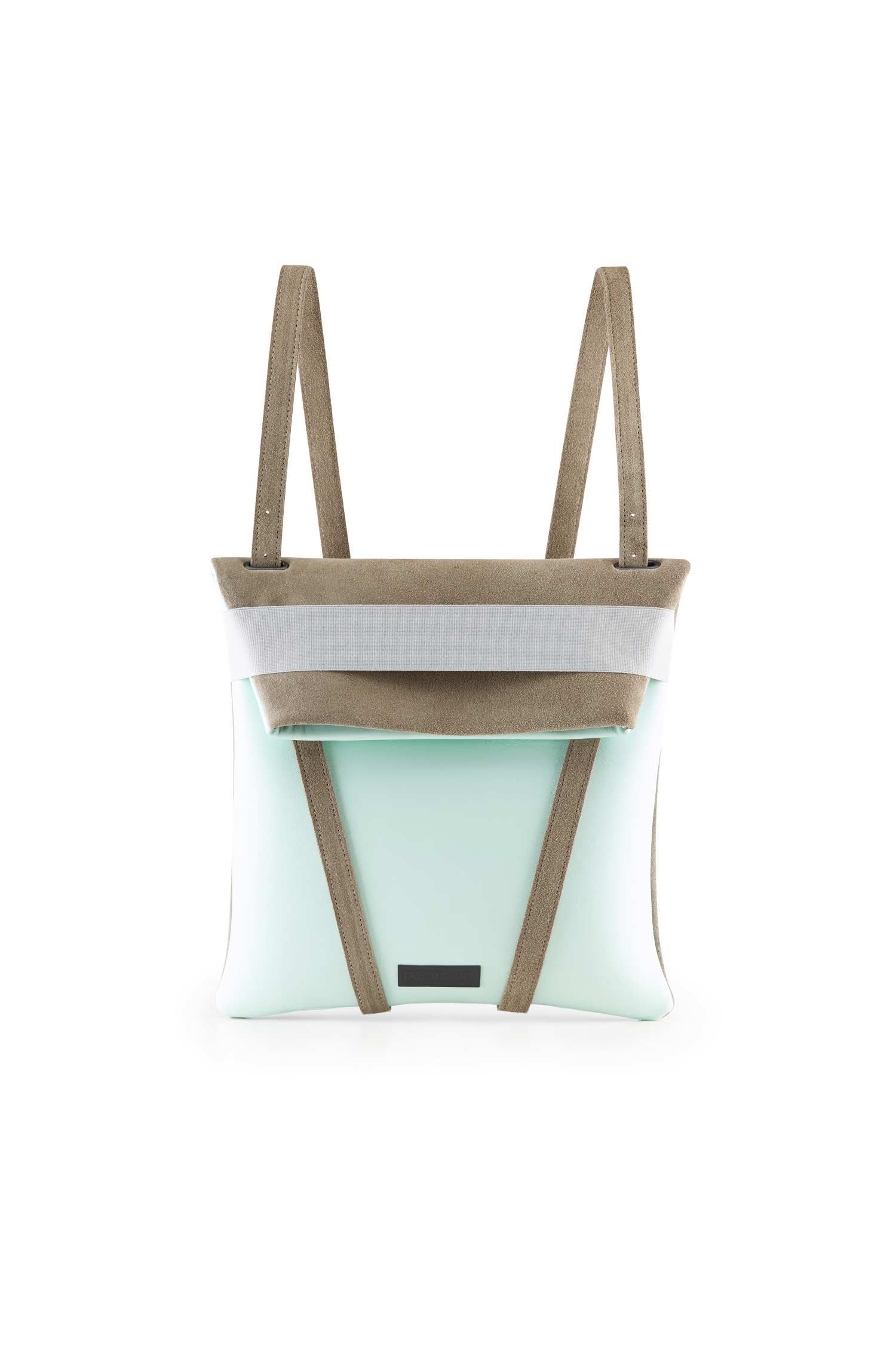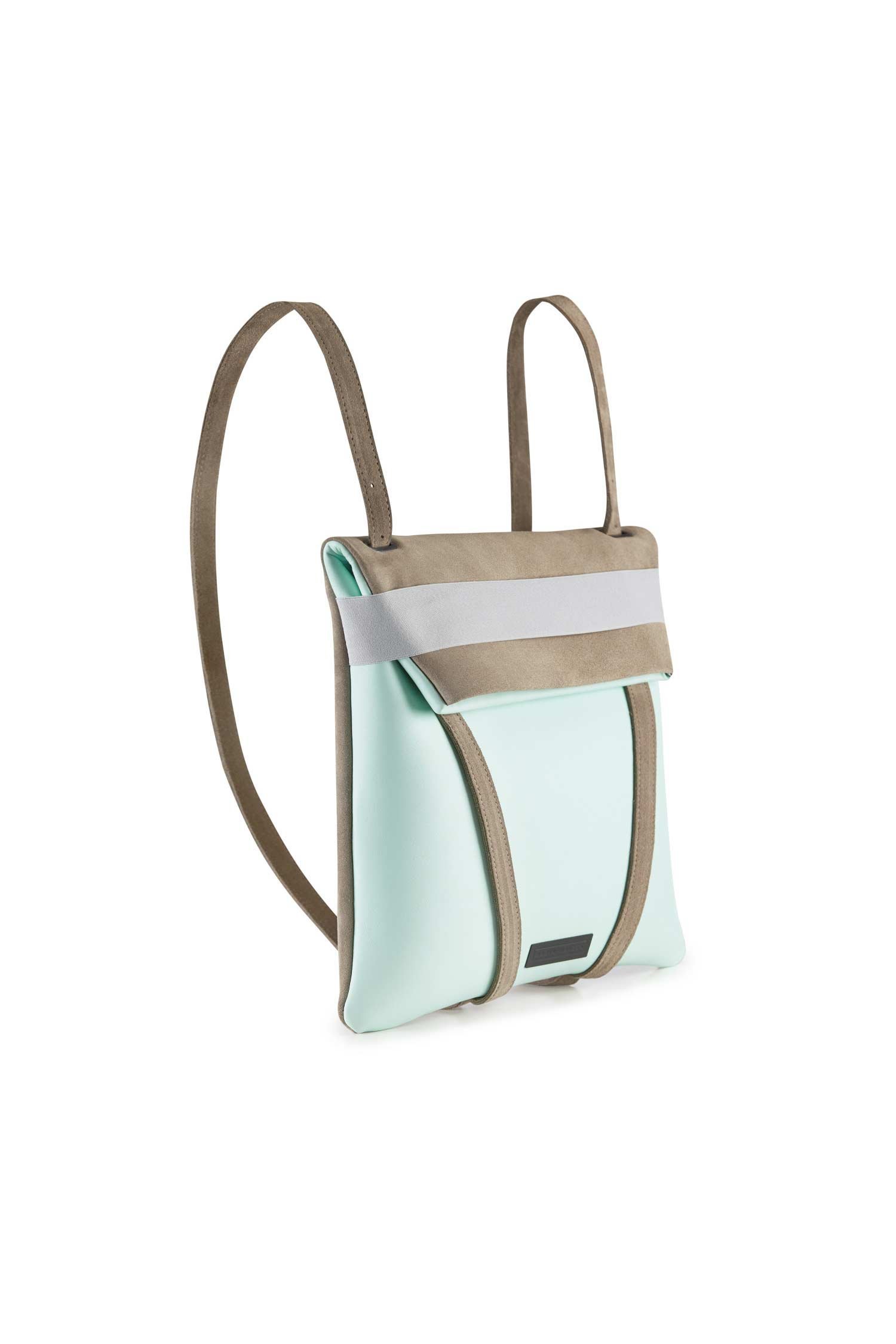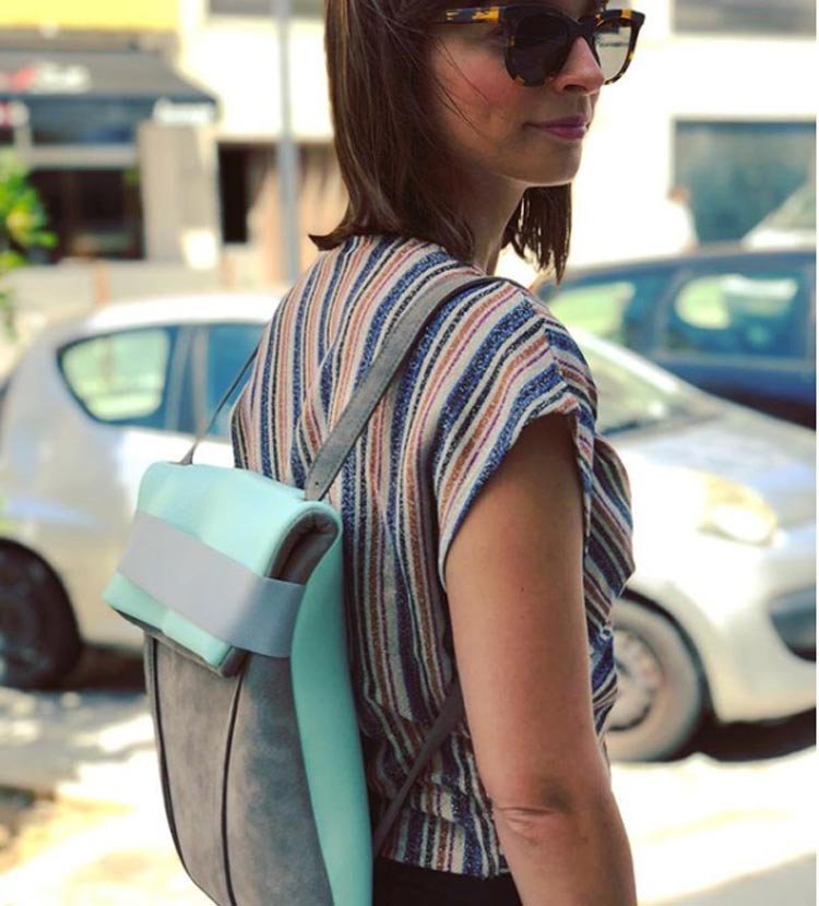 Backpack laptop bag in leather. Min blue and grey suede. Grey elastic and adjustable straps 70cm – 80cm. Two inner pockets. Dimensions: 35 x 33 cm. With an extra handle strap. REF. MMBPBT Made in Portugal